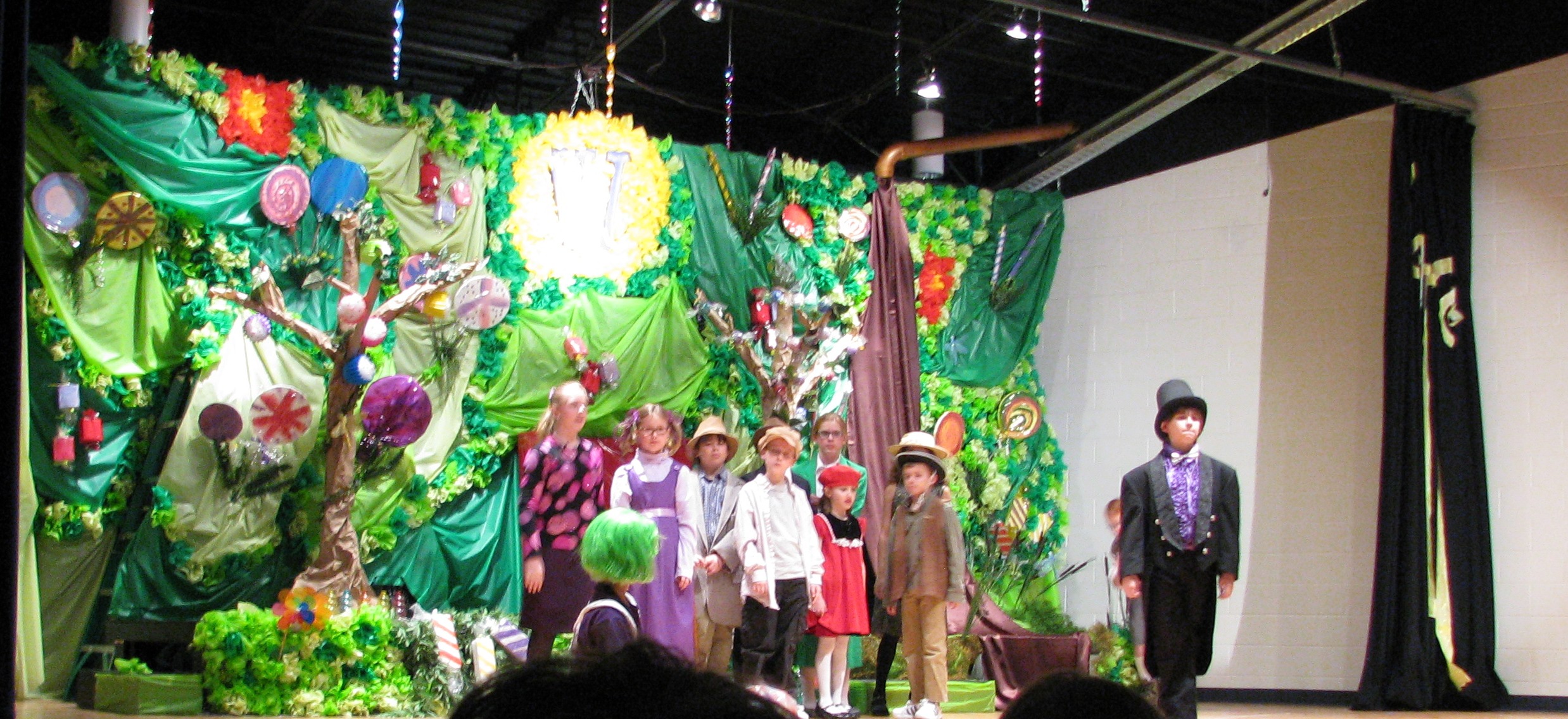 Continuing the chocolate factory tour with only four kids left. Augustus has already been lost in the chocolate river.