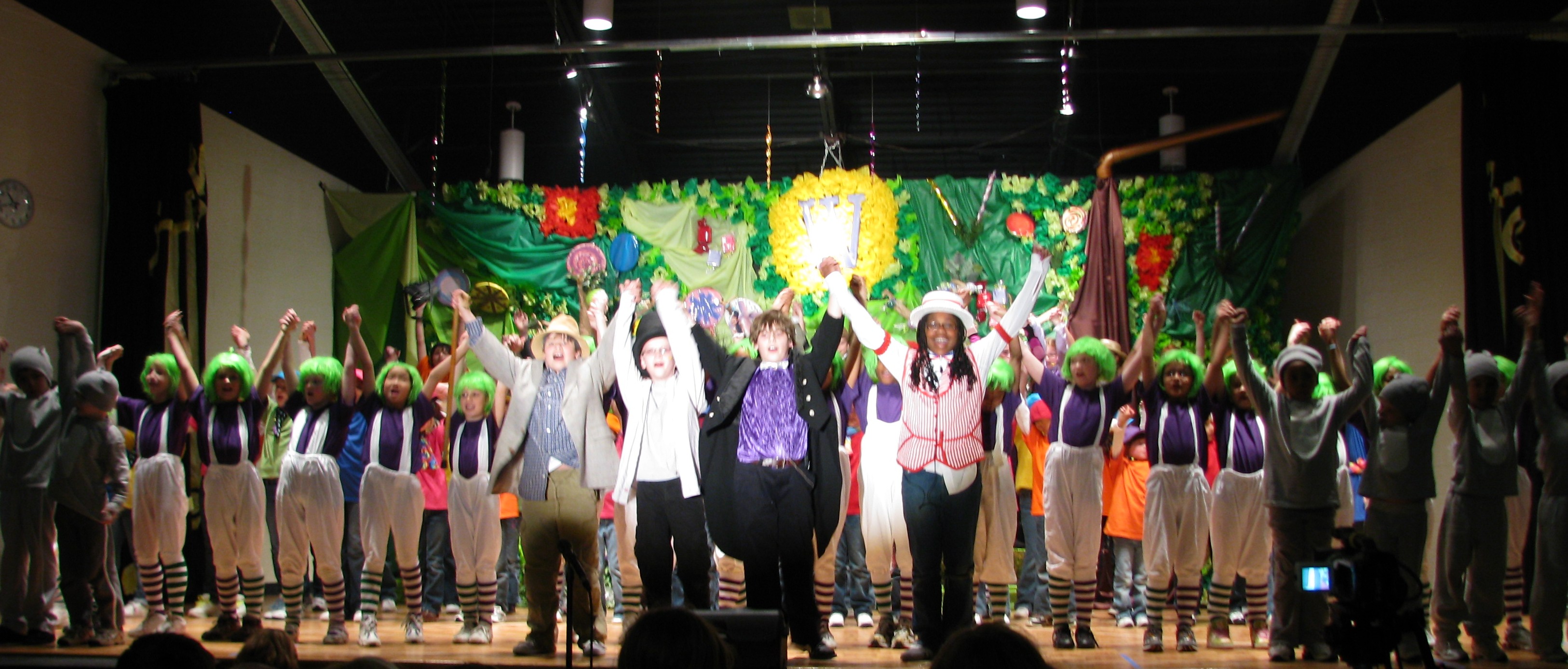 The entire cast out for the bow to the audience. Grandpa Joe, Charlie, Willy Wonka, and the Candy Man up front.