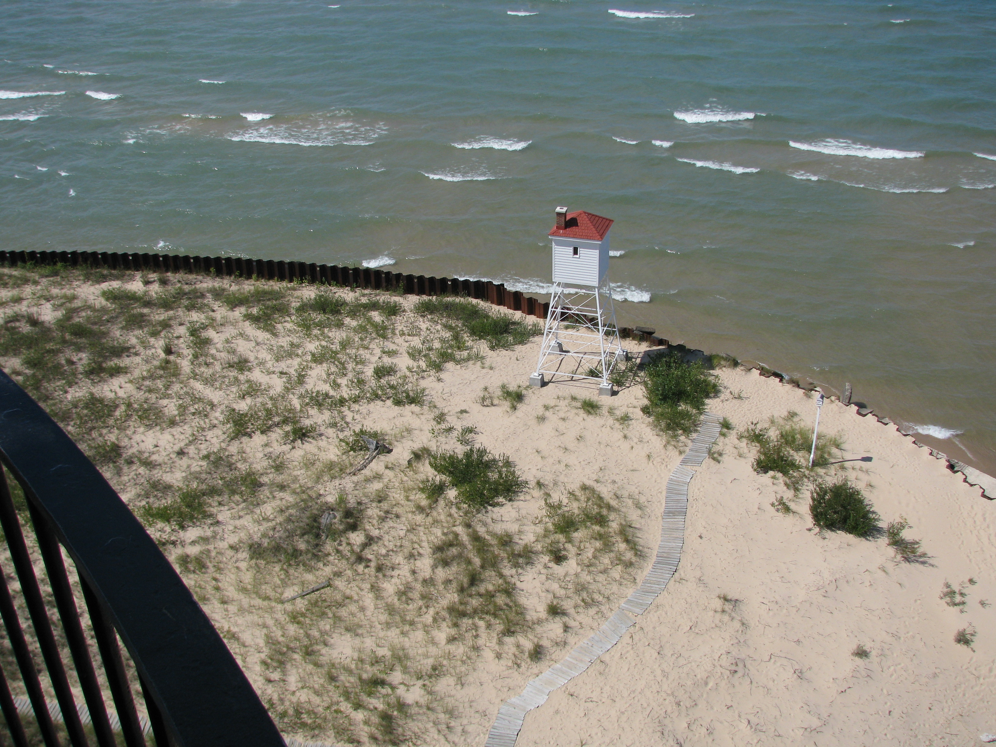 Looking toward the lake from the top of the lighthouse. The replica fog signal structure doesn’t actually have a fog signal in it.